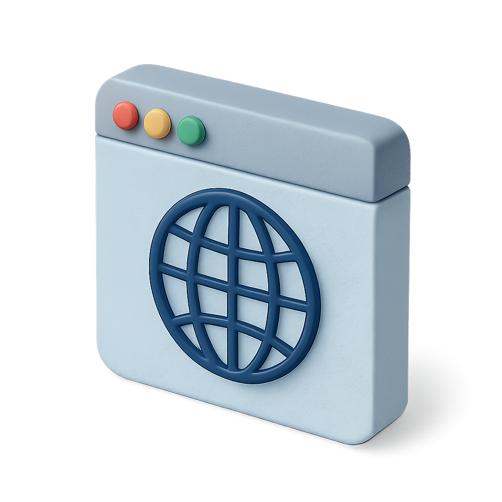 A sleek 3D browser icon depicted in a three-quarter view. The icon features a globe symbol, set against a transparent background, showcasing a modern isometric design.