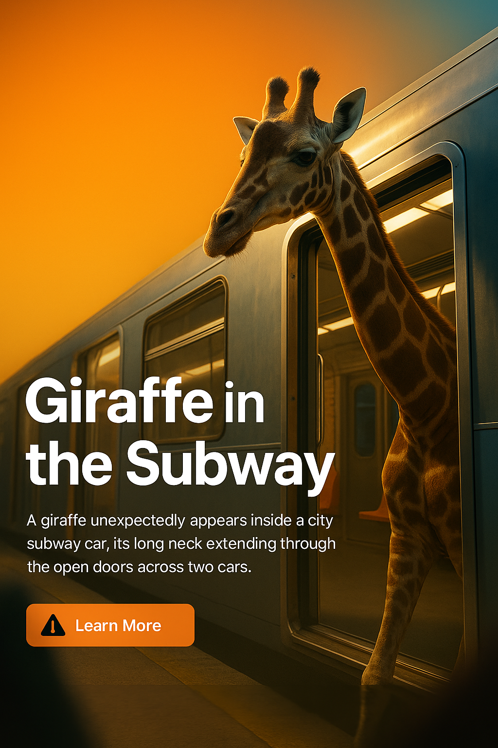 This visually striking image features a giraffe extending its neck through subway doors, blending urban life with wildlife. Ideal for social media or advertising.