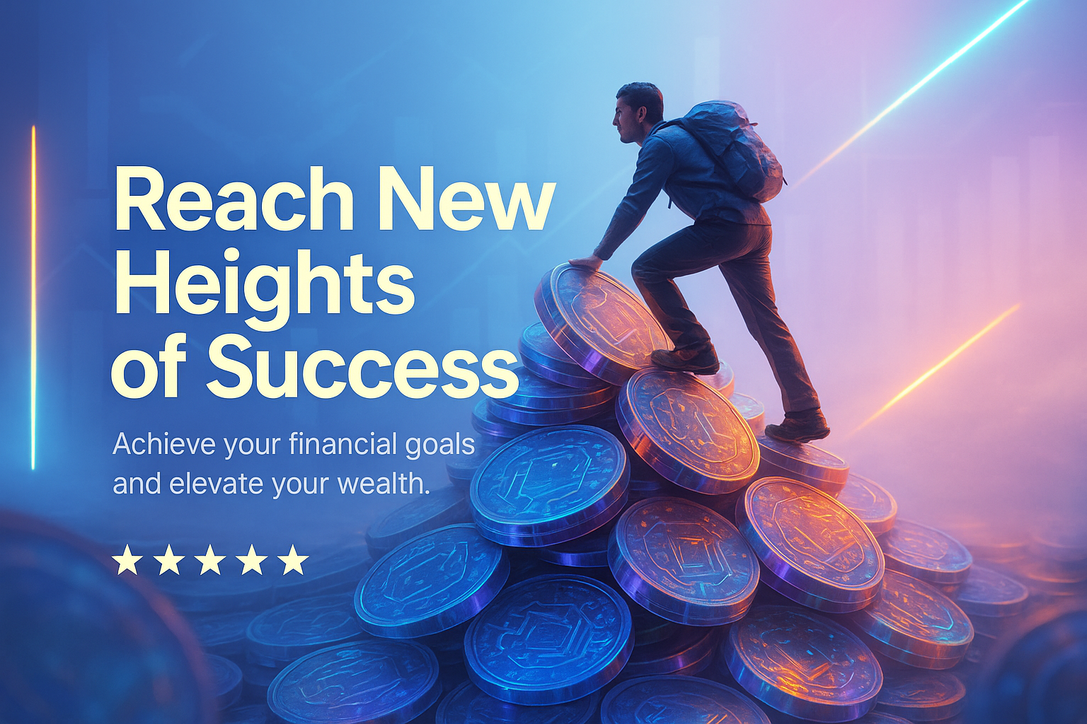 Motivational Financial Growth Graphic with Coins and Climbing Figure
