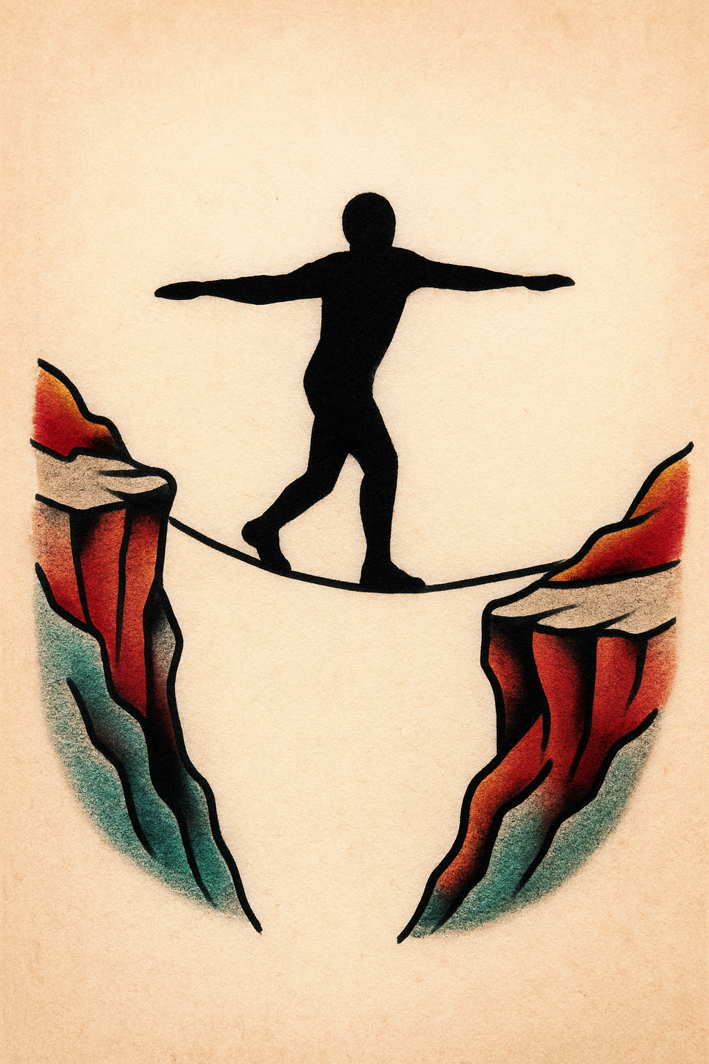 /Collection: /by davooda/Type: PNG/A striking tattoo design featuring a silhouette of a person balancing on a narrow rope above a chasm, with colorful cliffs on either side. The background is a soft beige.