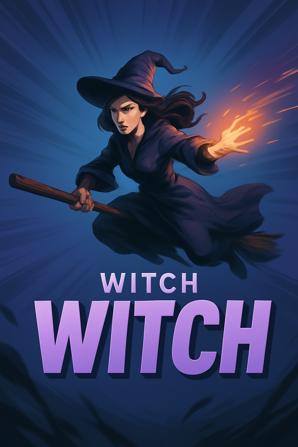 A striking illustration of a witch flying through a vibrant gradient background, casting a spell with a glowing hand. The title 'WITCH' is prominently displayed in a dynamic font, enhancing the visual impact.