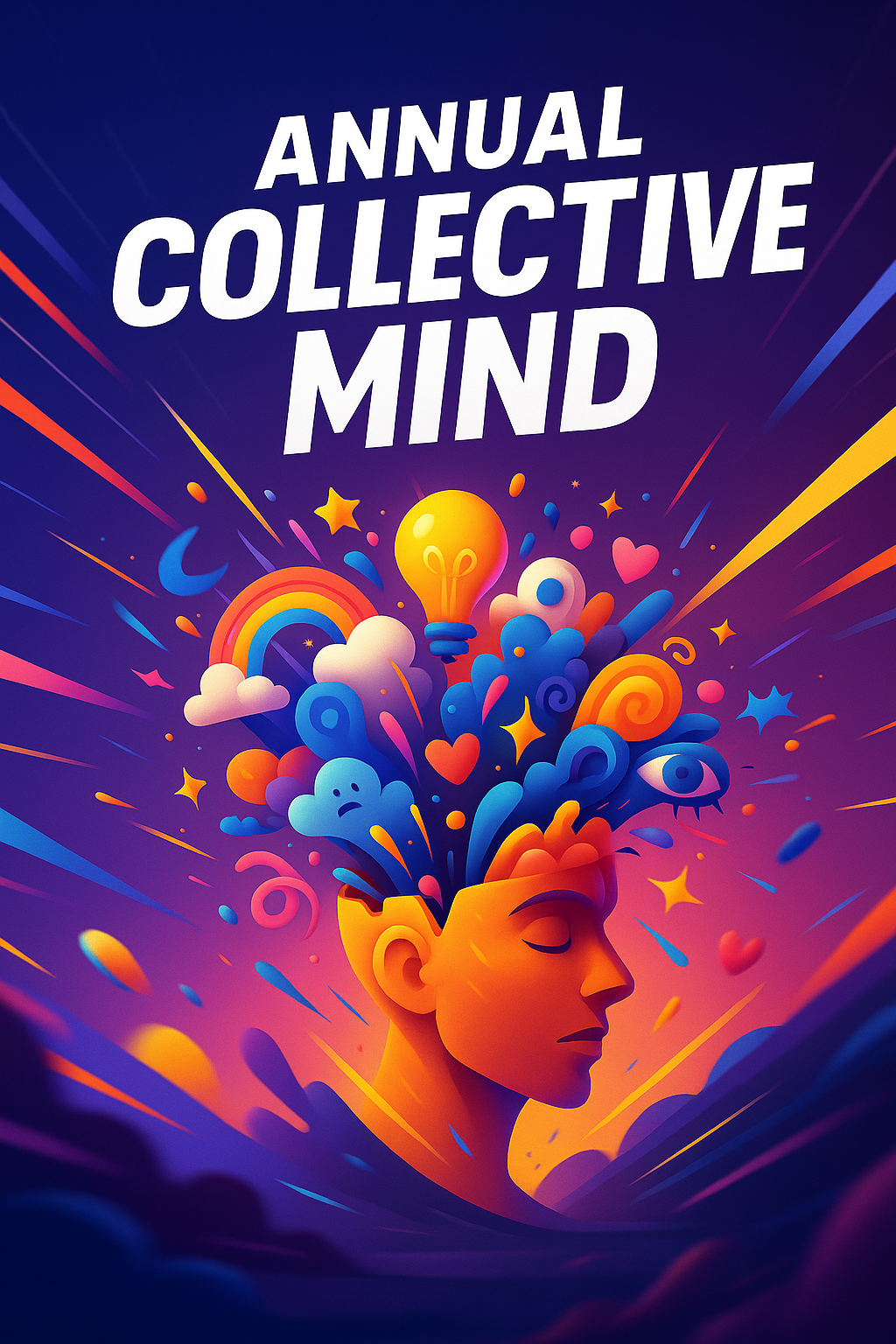 /Collection: /by davooda/Type: PNG/A vibrant illustration depicting the concept of a collective mind, featuring an explosion of colors and imaginative elements emerging from a human silhouette, symbolizing creativity and emotions.
