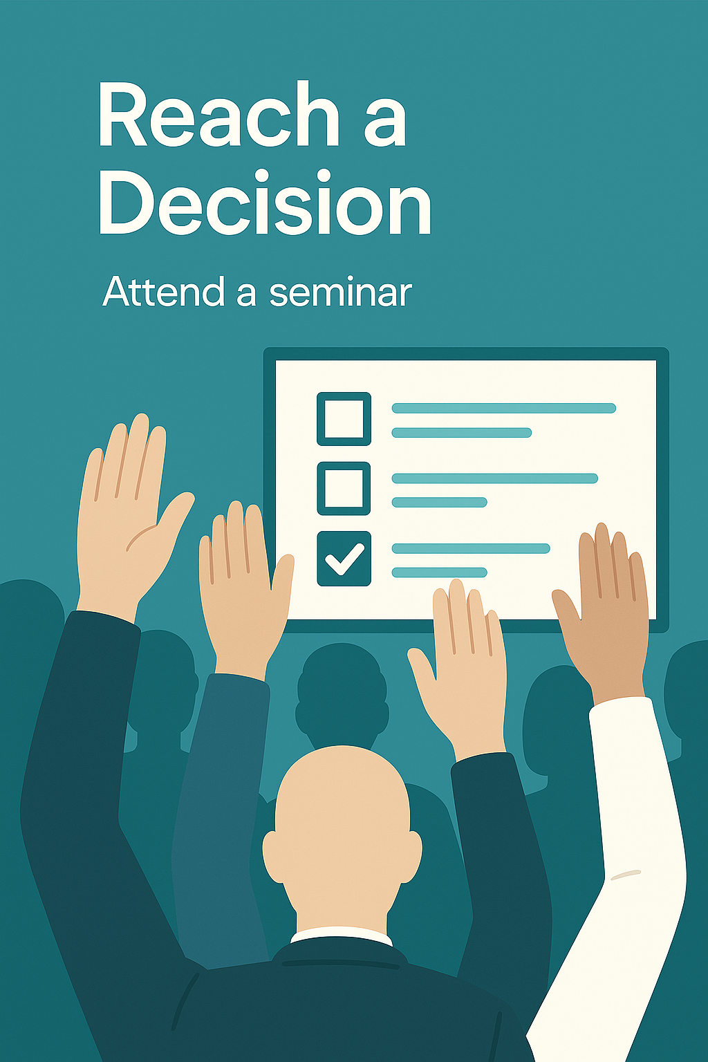 Vector-style illustration depicting a diverse audience raising hands to participate in a seminar decision-making process, ideal for event promotion.