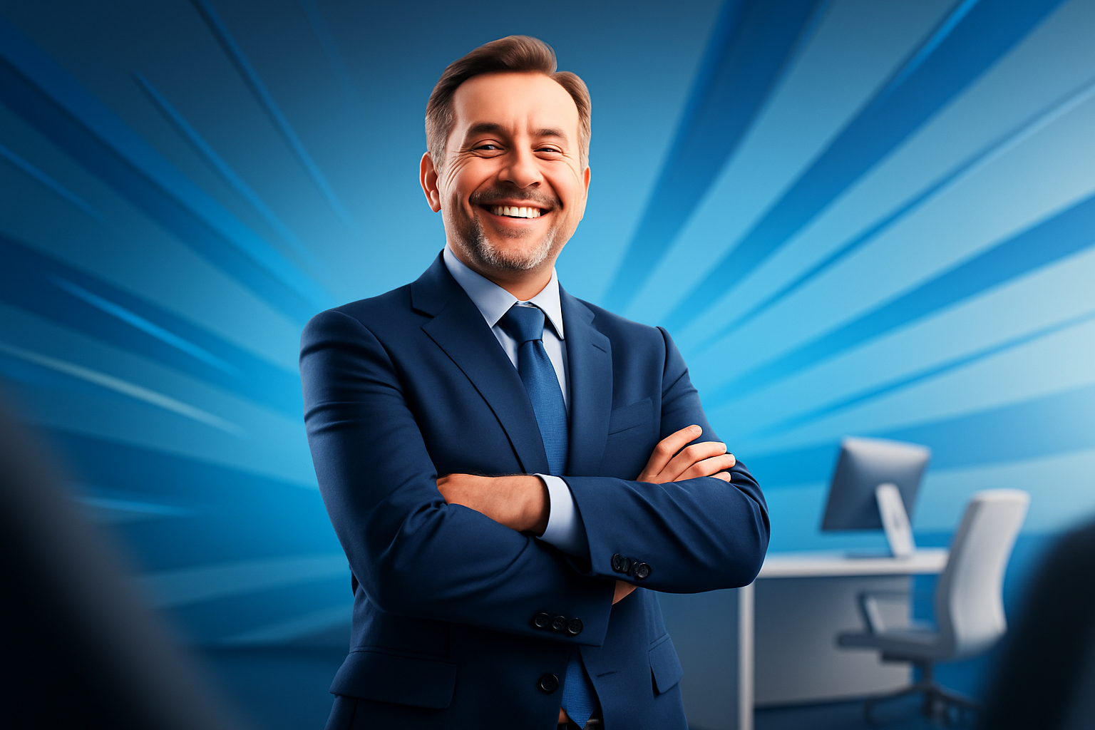 /Collection: /by davooda/Type: PNG/A smiling middle-aged businessman stands confidently in a blue suit with arms crossed in an office setting. The background features dynamic rays of blue, enhancing the professional atmosphere.