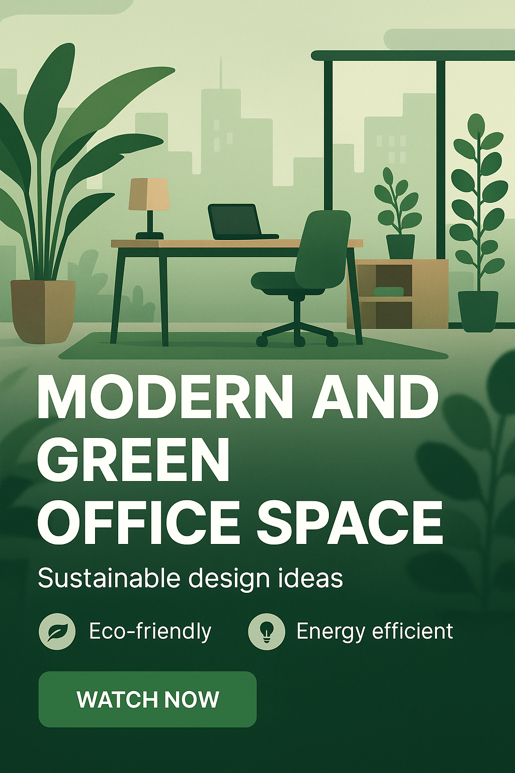 Promotional graphic showcasing modern and eco-friendly office space design ideas, featuring a minimalist style with green tones, ideal for sustainability-focused audiences.