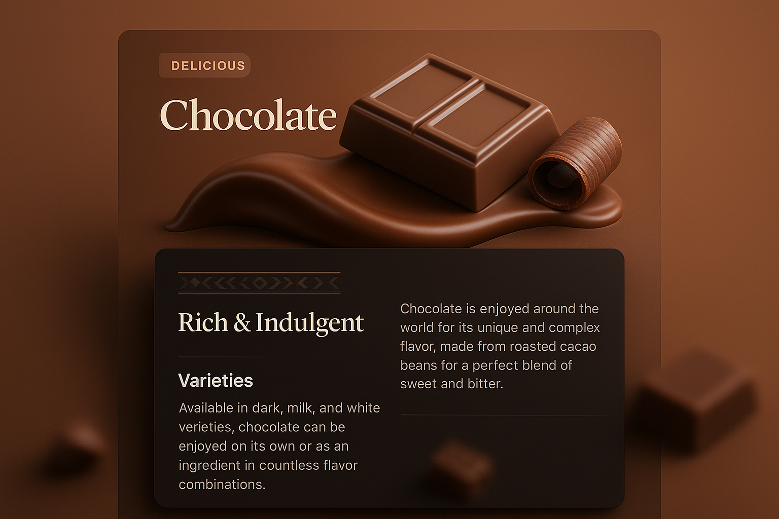 /Collection: /by davooda/Type: PNG/A stunning 3D illustration of chocolate featuring a rich color palette. The design incorporates elegant text blocks and patterns, highlighting the indulgent qualities of chocolate.