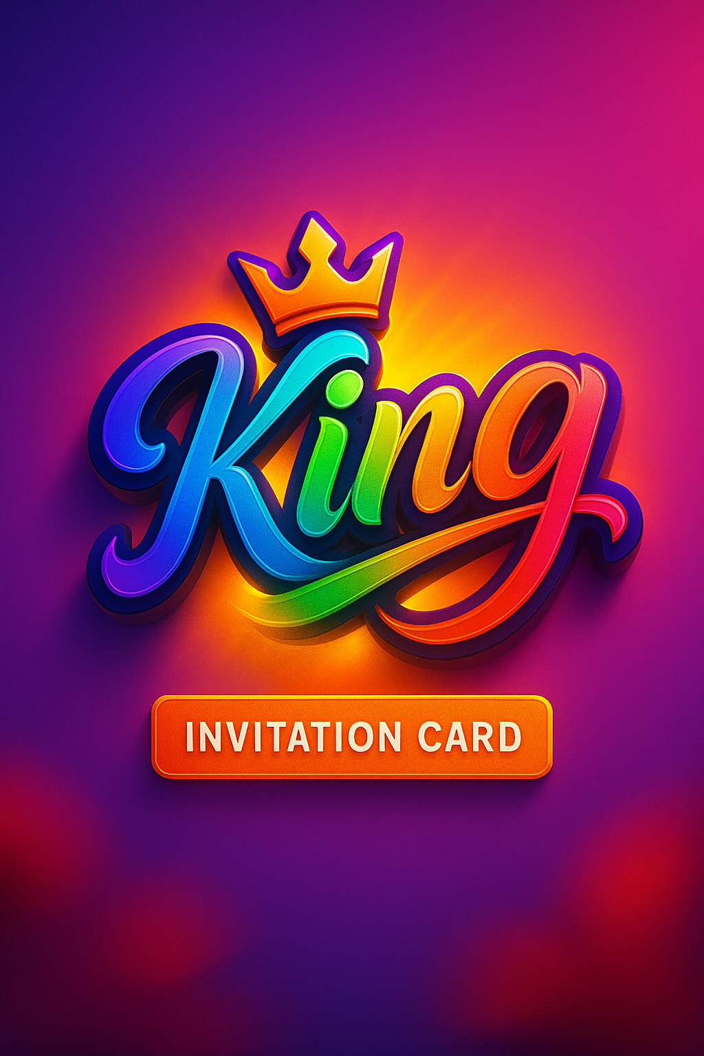 /Collection: /by davooda/Type: PNG/This vibrant invitation card features a bold, stylized 'King' text with a crown, ideal for royal-themed events or parties. The gradient colors and glowing effects add a festive touch.