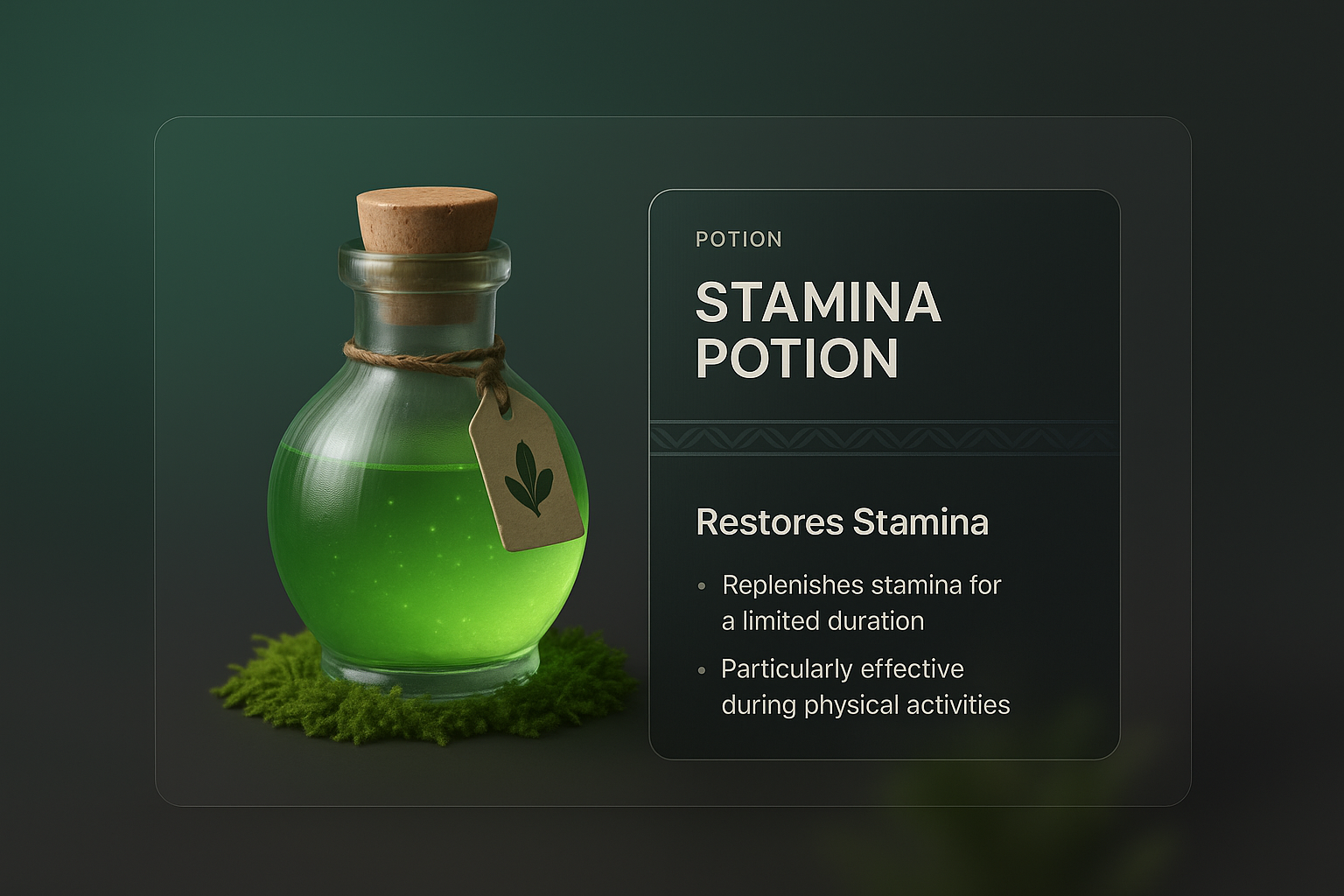 /Collection: /by davooda/Type: PNG/A 3D illustration of a green stamina potion in a glass bottle, featuring a rustic cork and a label. The design includes a dark overlay with text detailing the potion's effects, creating a cohesive visual.
