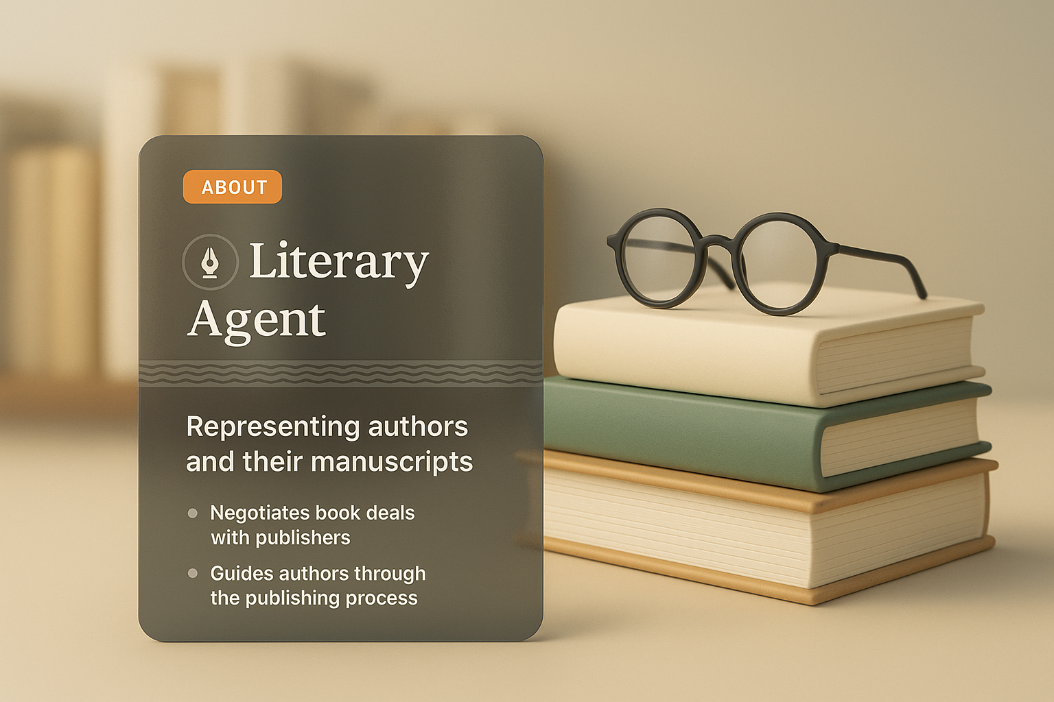 /Collection: /by davooda/Type: PNG/A sophisticated web page design featuring a 3D illustration of books and glasses, with an integrated info block highlighting literary agent services. The light backdrop enhances readability.