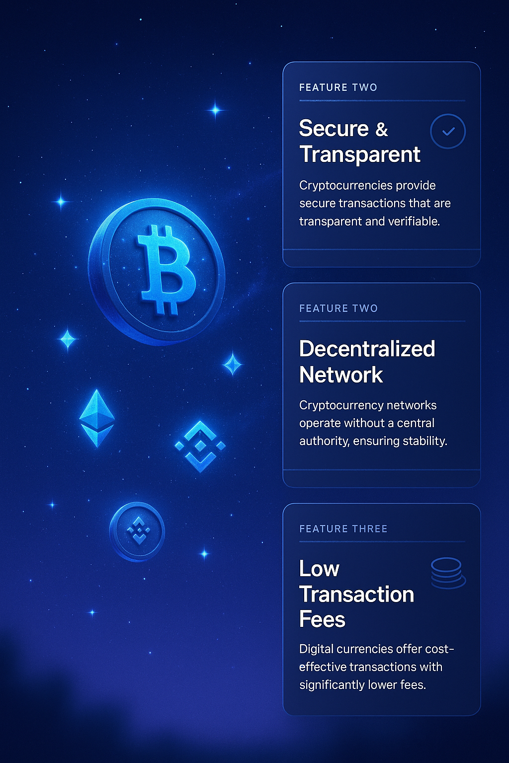 A captivating 3D illustration of cryptocurrency coins floating like stars in a night sky, complemented by feature blocks detailing their benefits.