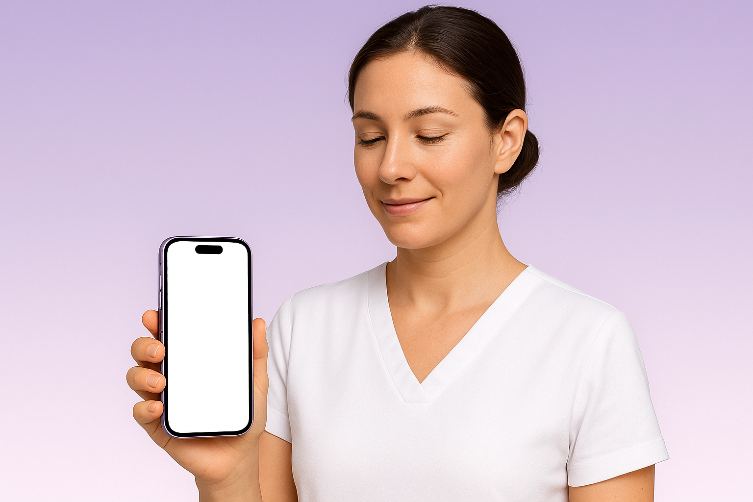 A calm woman in a white massage therapist outfit holds a purple smartphone with a blank white screen. The background features a soft purple gradient.