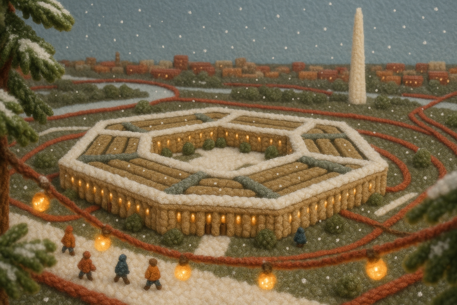/Collection: /by davooda/Type: PNG/A cozy winter scene featuring a woolen Pentagon surrounded by soft, thick yarn-like textures. Snow gently falls, while small figures stroll through a vibrant landscape adorned with lights, creating a festive atmosphere.