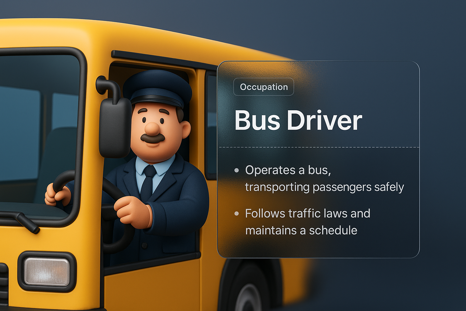 A vibrant 3D illustration featuring a cheerful bus driver inside a bus. The design includes informational text blocks with a smooth gradient background, emphasizing the driver's occupation.