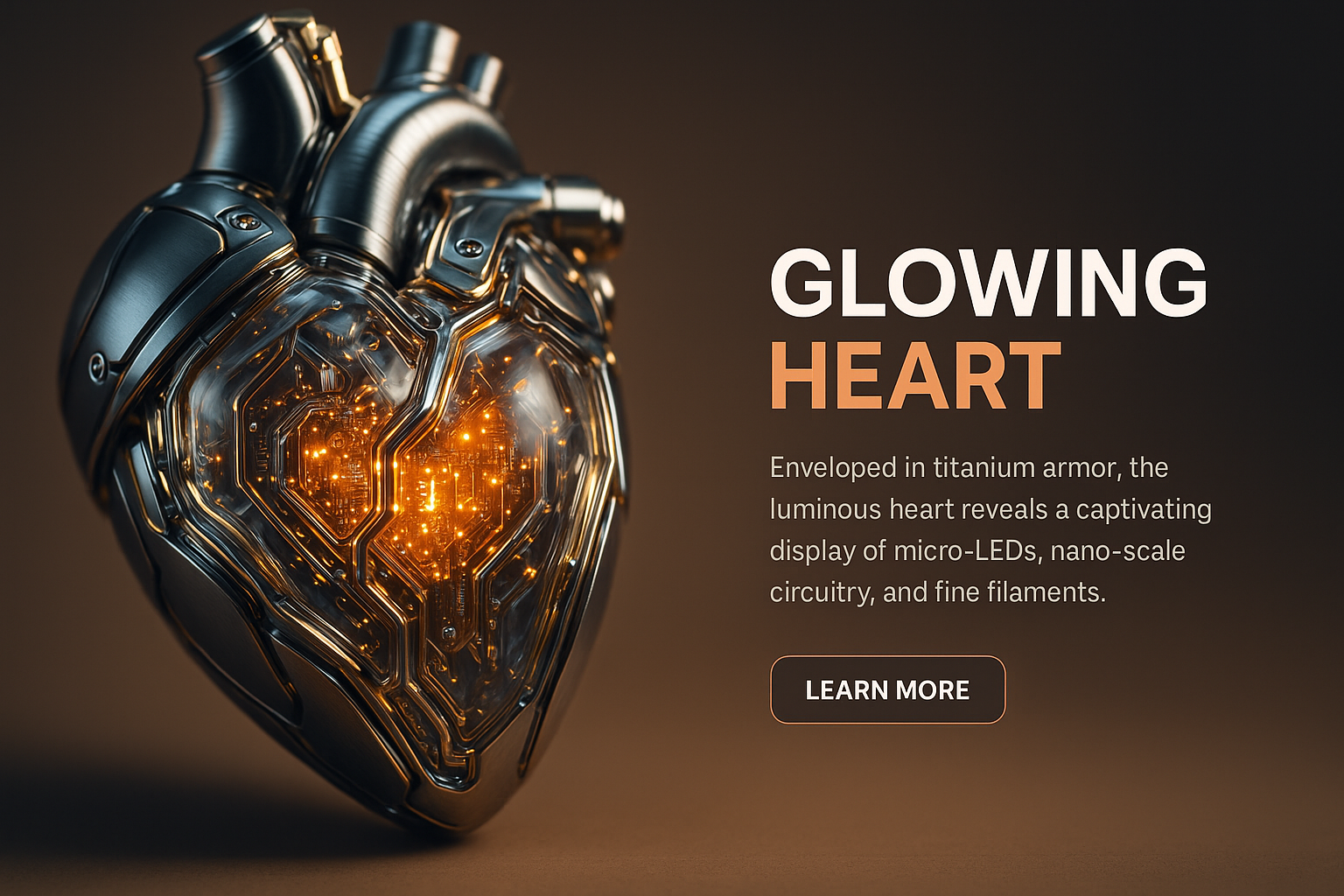 /Collection: /by davooda/Type: PNG/A hyperrealistic close-up of a glowing heart encased in titanium armor. The heart showcases intricate micro-LEDs, circuit boards, and metallic components, reflecting light beautifully.