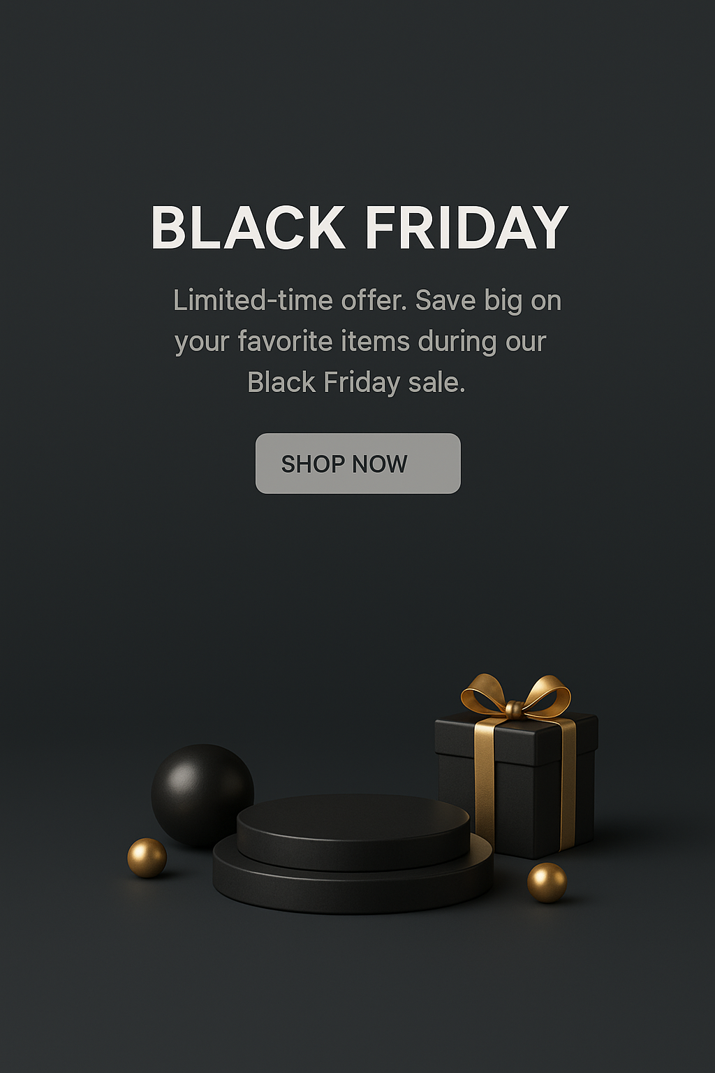 /Collection: /by davooda/Type: PNG/A sophisticated Black Friday banner featuring a podium with black and gold elements. The dark scene creates an elegant backdrop for promotional text and a call-to-action button.