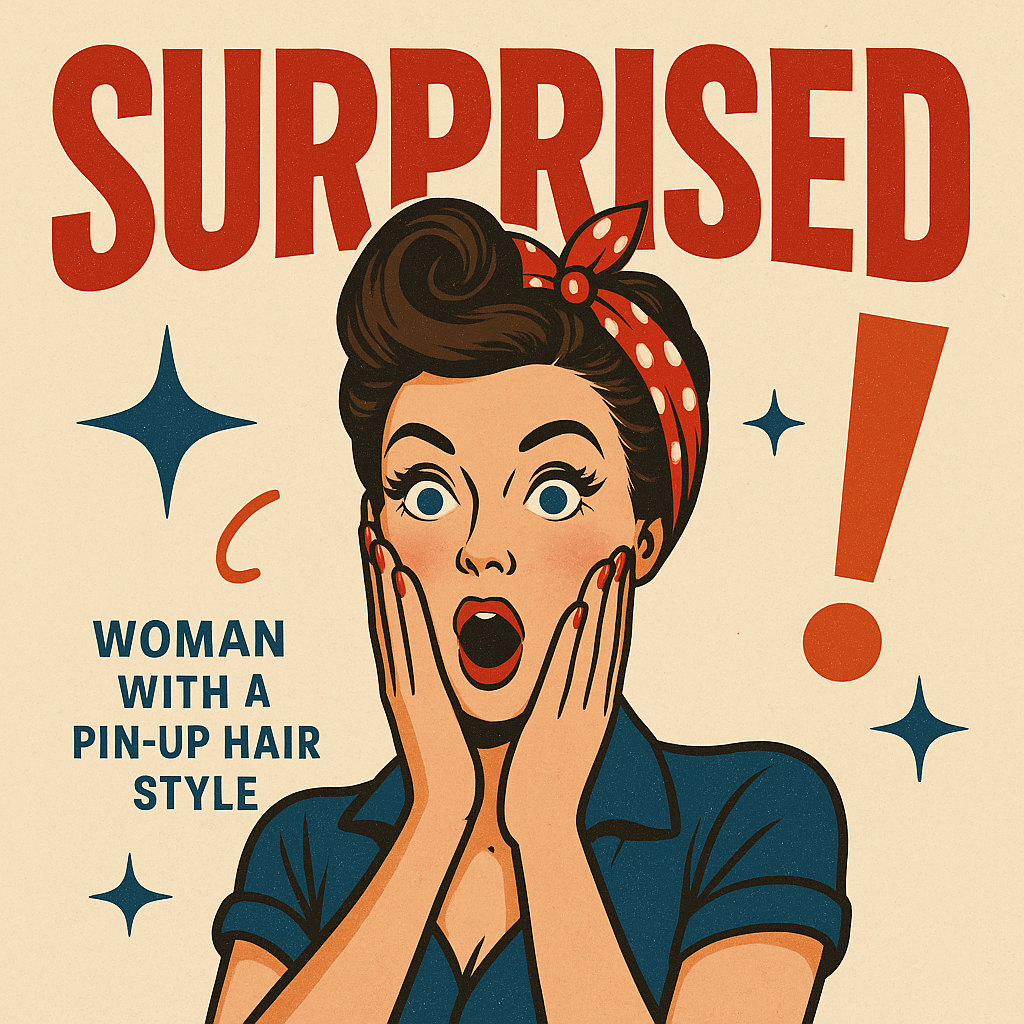 Vibrant retro-style illustration depicting a surprised woman with a pin-up hairstyle, ideal for social media or advertising. The design uses bold colors and comic book aesthetics.