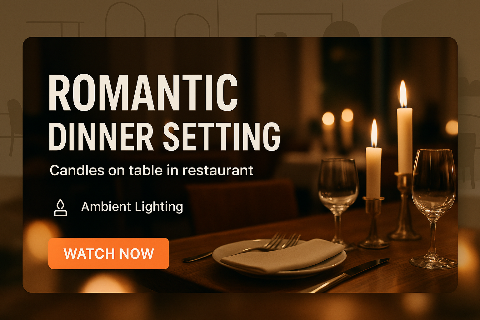 A visually appealing promotional image showcasing a romantic dinner setting with candles and ambient lighting, ideal for restaurant marketing and advertisements.