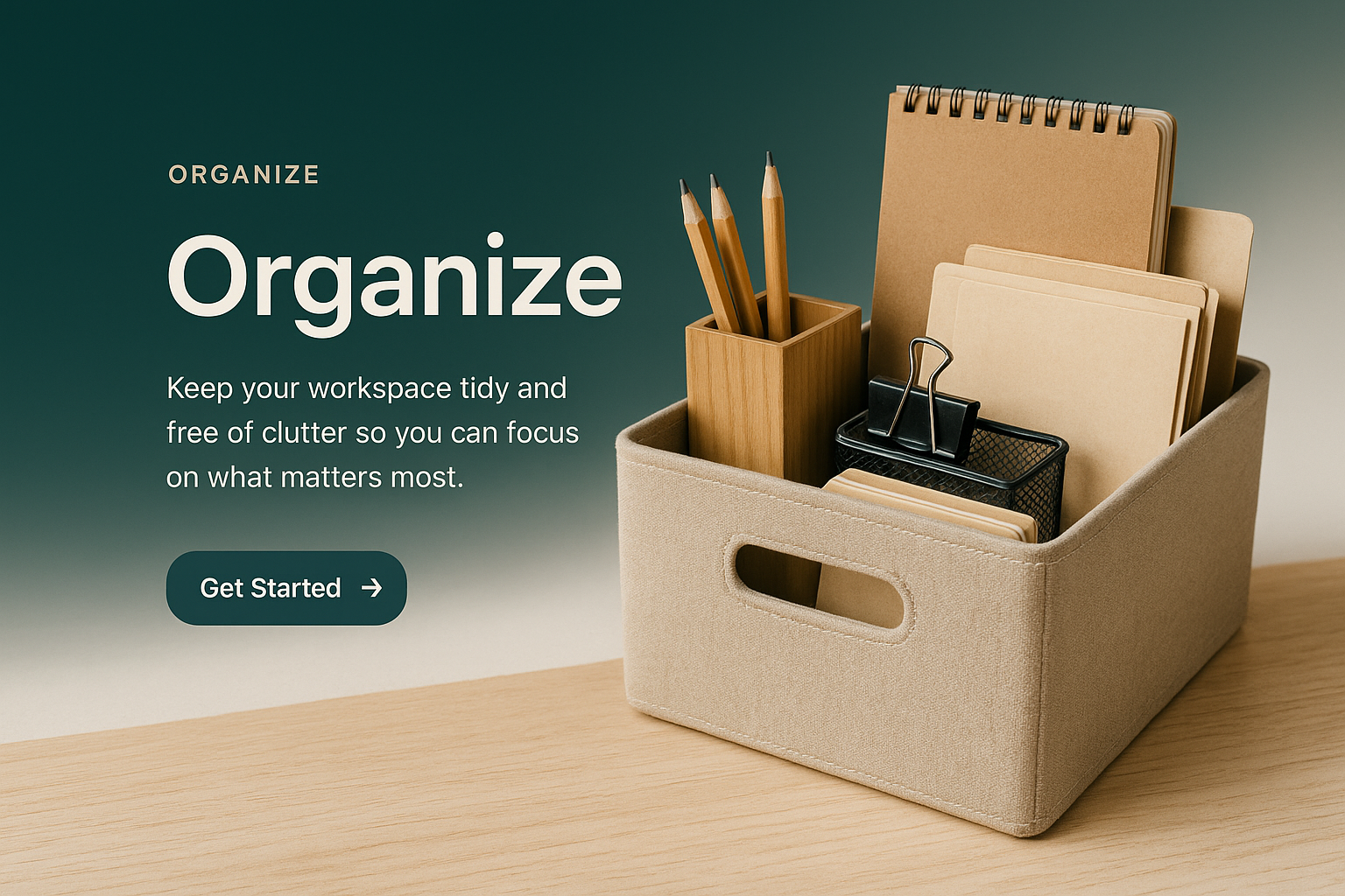 A visually appealing workspace organization concept featuring a storage box filled with stationery items. The design includes a gradient background transitioning from dark to light, enhancing clarity.