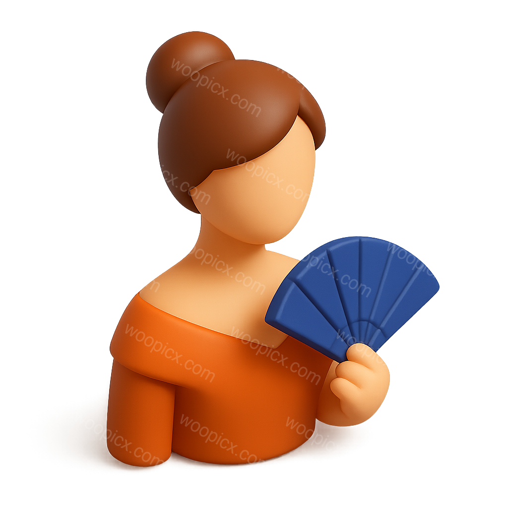 A minimalist 3D representation of a woman holding a blue fan, designed in an isometric view. The character features a bun hairstyle and an orange top, set against a soft background.