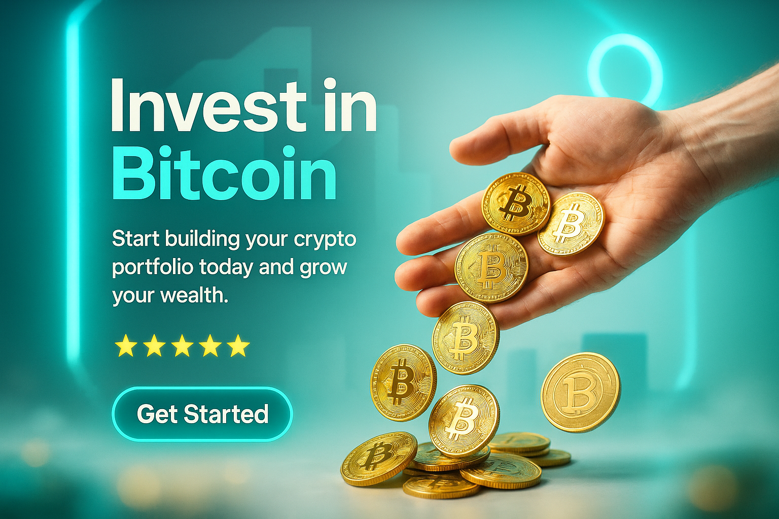 /Collection: /by davooda/Type: PNG/Engaging promotional graphic encouraging Bitcoin investment, featuring a hand releasing gold coins. Ideal for financial services marketing targeting crypto enthusiasts.