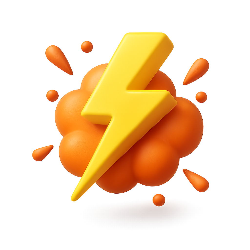 A dynamic 3D icon of a bright yellow lightning bolt surrounded by an orange explosive cloud, designed in a three-quarter view for a striking visual impact.