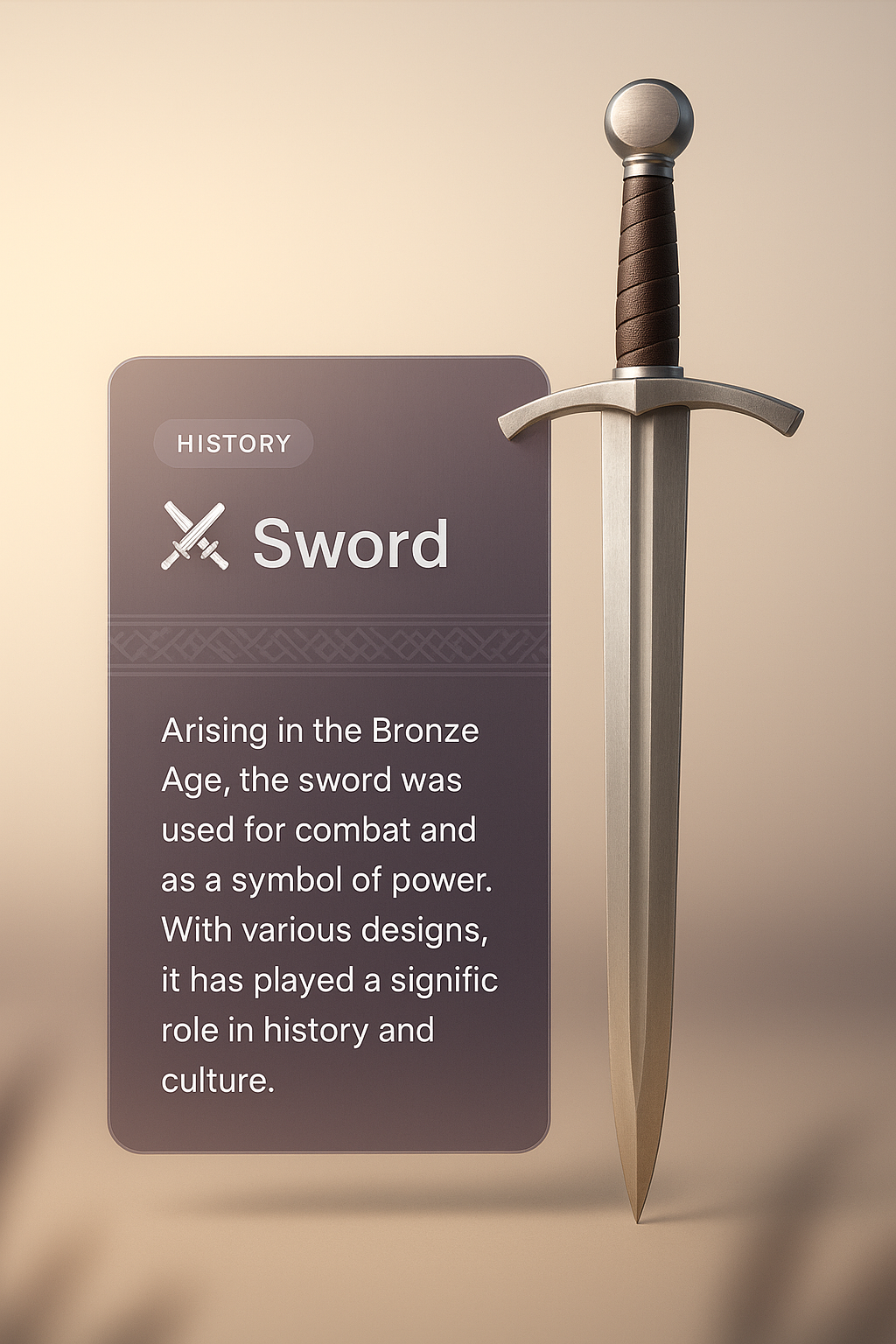 A modern 3D illustration of a sword with an informative overlay. The background features a soft gradient, enhancing the sword's significance in history and culture.