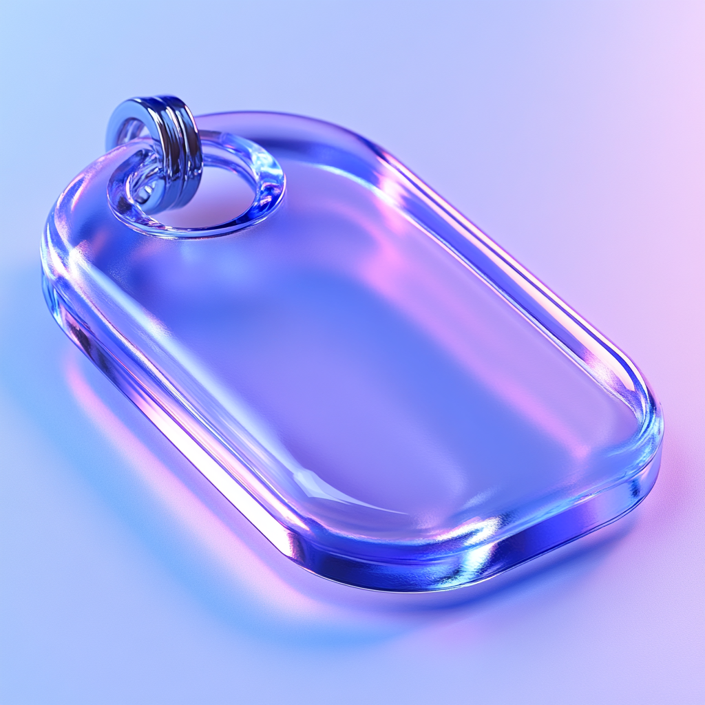 Stylish 3D rendering of a transparent glass tag featuring soft lighting and gradient colors, ideal for branding or product labeling.