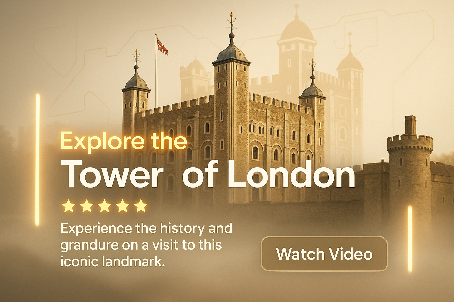 /Collection: /by davooda/Type: PNG/Engaging promotional graphic featuring the Tower of London, designed to entice viewers to watch a video about this historical site, with a modern layout and warm color palette.