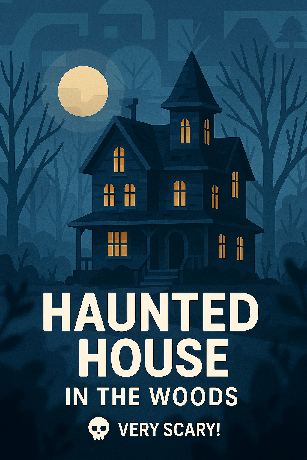 /Collection: /by davooda/Type: PNG/Illustrative graphic featuring a dark, eerie haunted house surrounded by trees, perfect for Halloween-themed events or promotions. The design uses a moody color palette to evoke a sense of mystery.