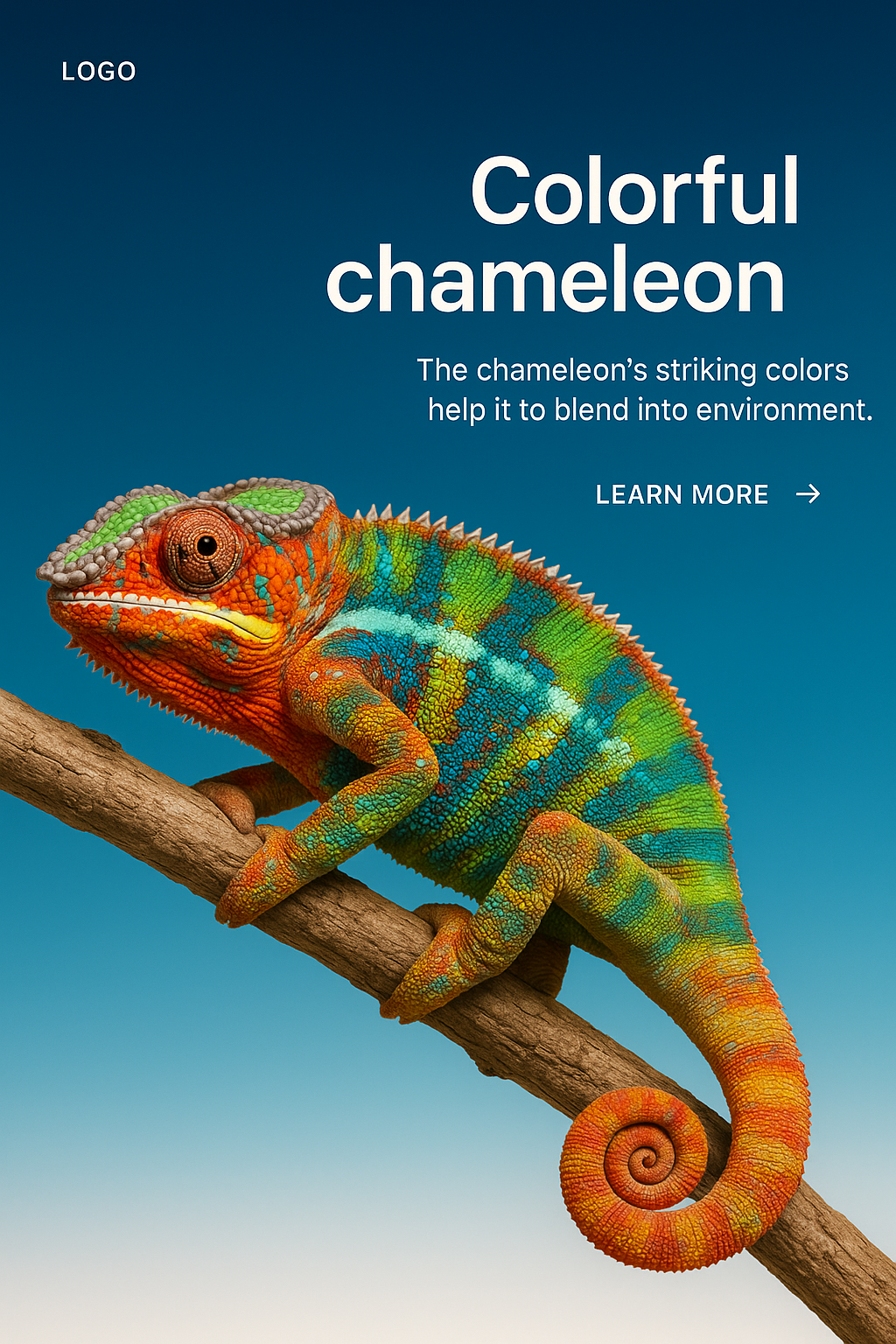 /Collection: /by davooda/Type: PNG/A vivid chameleon perched on a branch against a blue gradient background. The image showcases the chameleon's colorful patterns and textures, with accompanying text promoting engagement.