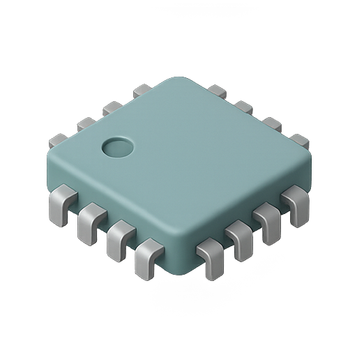 A stylized 3D representation of a microchip featuring pin connections, ideal for technology-related content. The design emphasizes a modern and clean aesthetic for use in electronics and software applications.