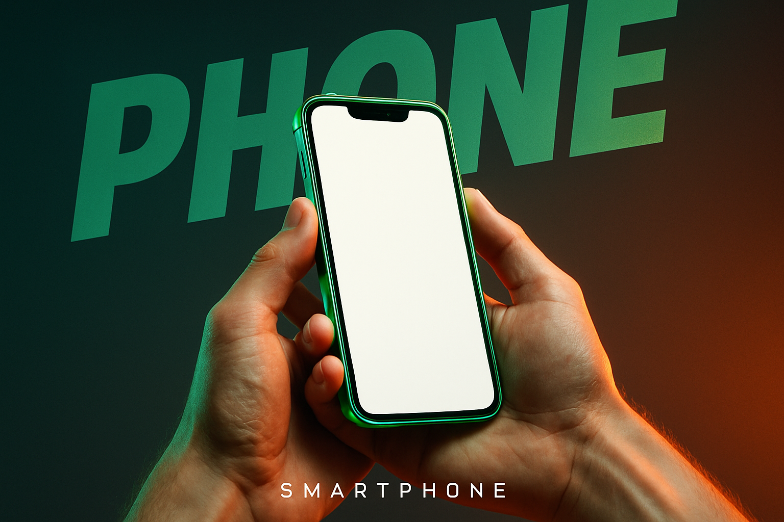 /Collection: /by davooda/Type: PNG/A hands-on presentation of a green smartphone with a blank screen, featuring bold diagonal typography in a dramatic gradient background. The composition is modern and cinematic.