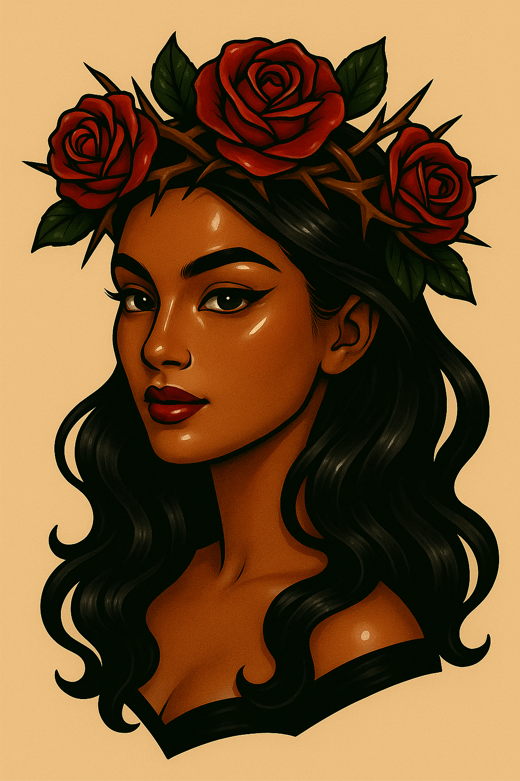 /Collection: /by davooda/Type: PNG/A striking illustration of a woman adorned with a crown made of thorns and red roses. Her glossy skin and expressive features capture attention, set against a subtle beige background.