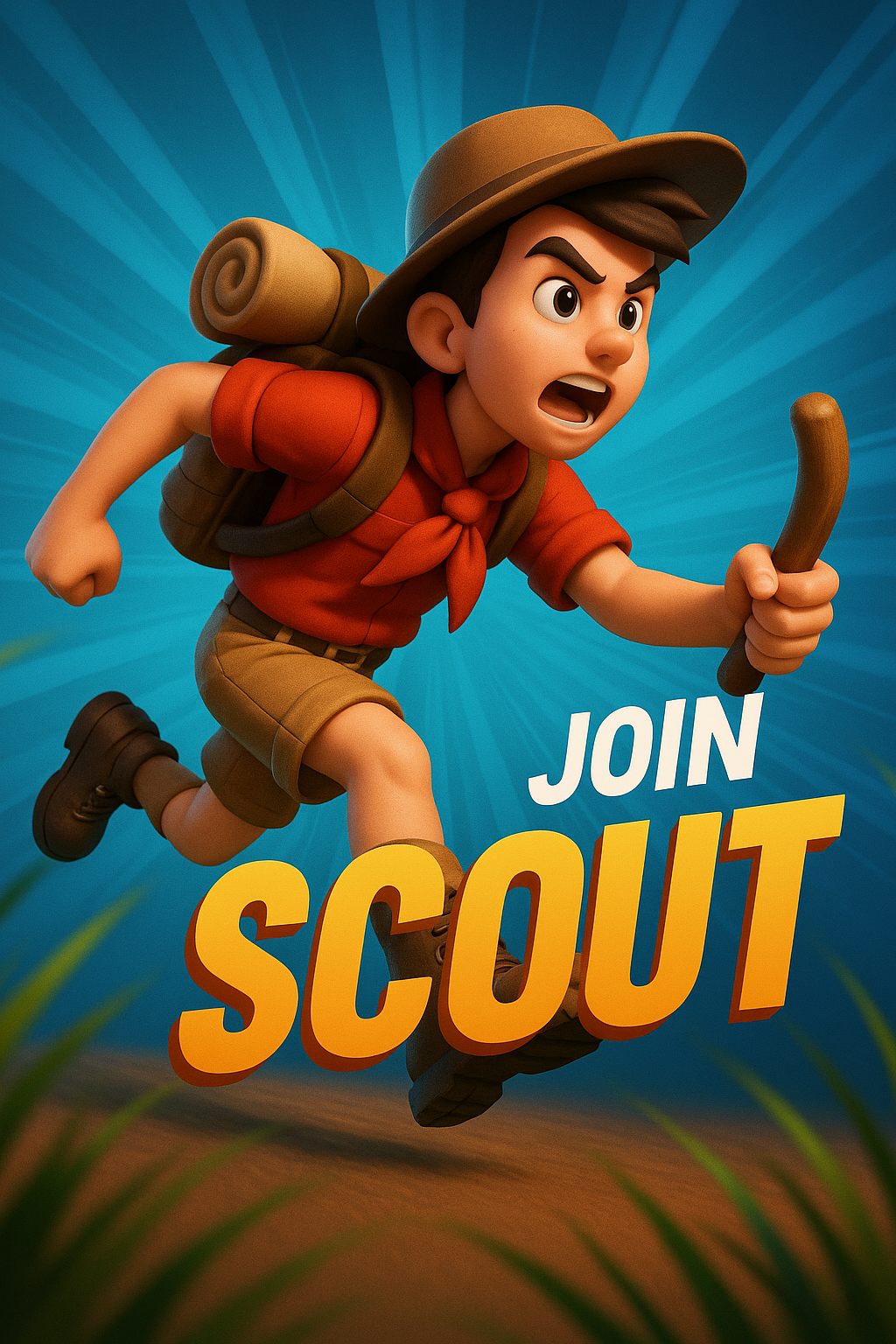 /Collection: /by davooda/Type: PNG/A vibrant 3D illustration of a scout in action, running energetically with a stick, set against a smooth gradient background. The title 'JOIN SCOUT' is prominently displayed with bold typography.