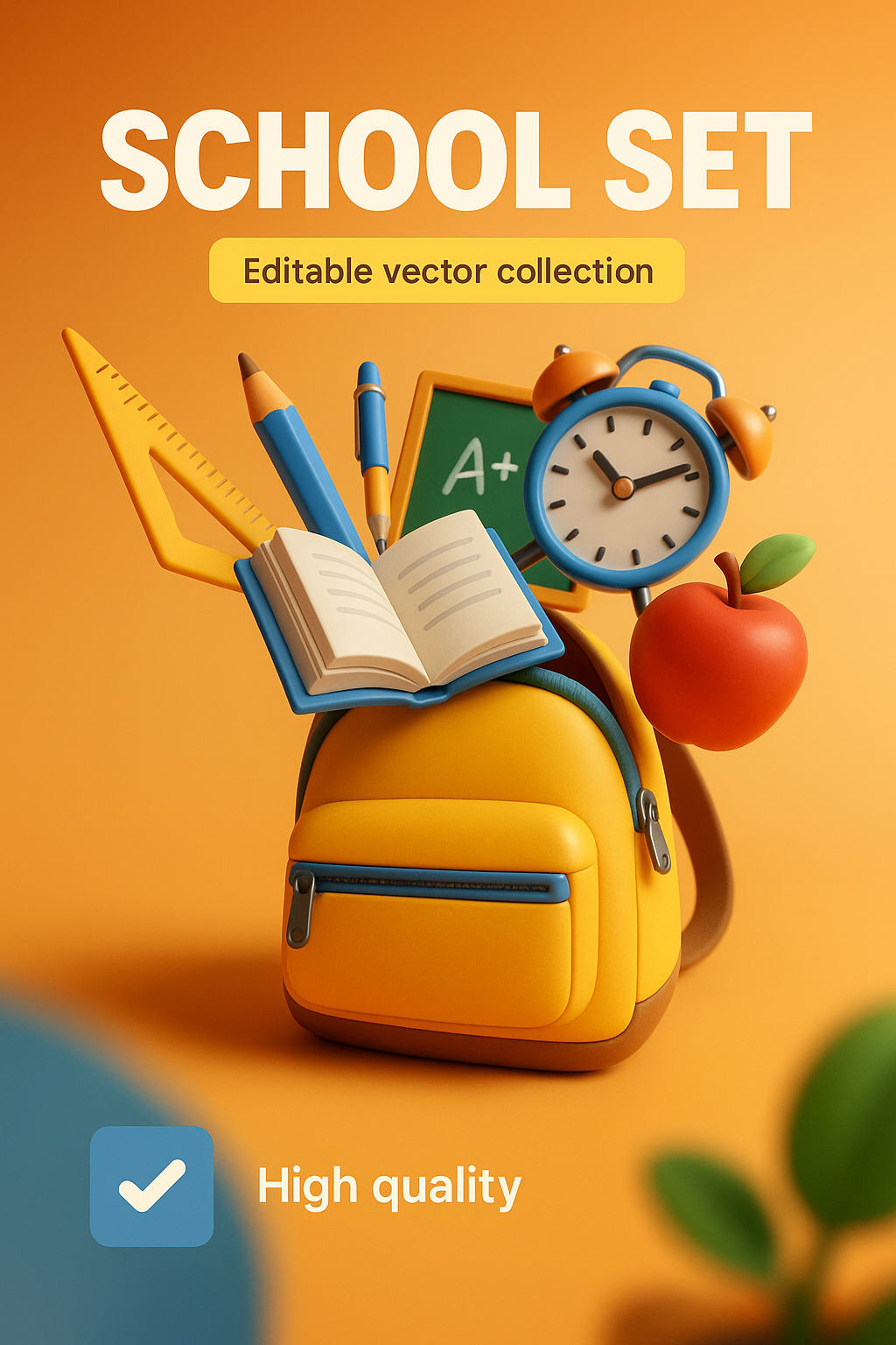 This image features a vibrant 3D illustration of a school backpack filled with various educational items. It's designed for promotional use in educational contexts.