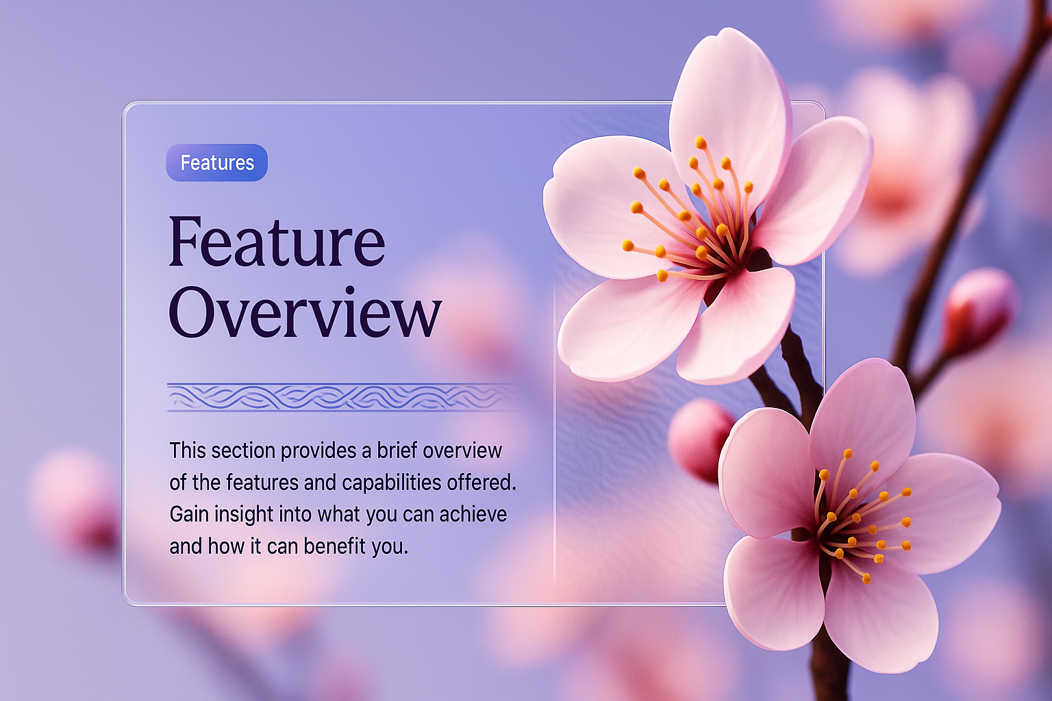 A captivating design featuring beautiful 3D sakura flowers against a smooth gradient background. The composition includes a transparent feature overview block, enhancing the floral aesthetics.