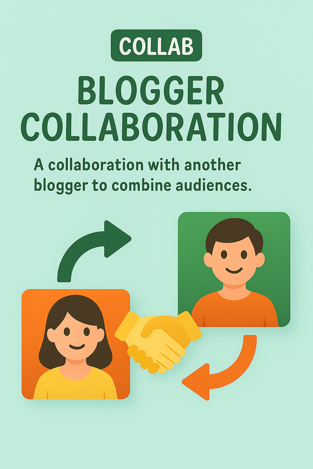 Colorful graphic illustrating the concept of blogger collaboration, featuring cartoon characters and handshake icons, suitable for social media or blog use.