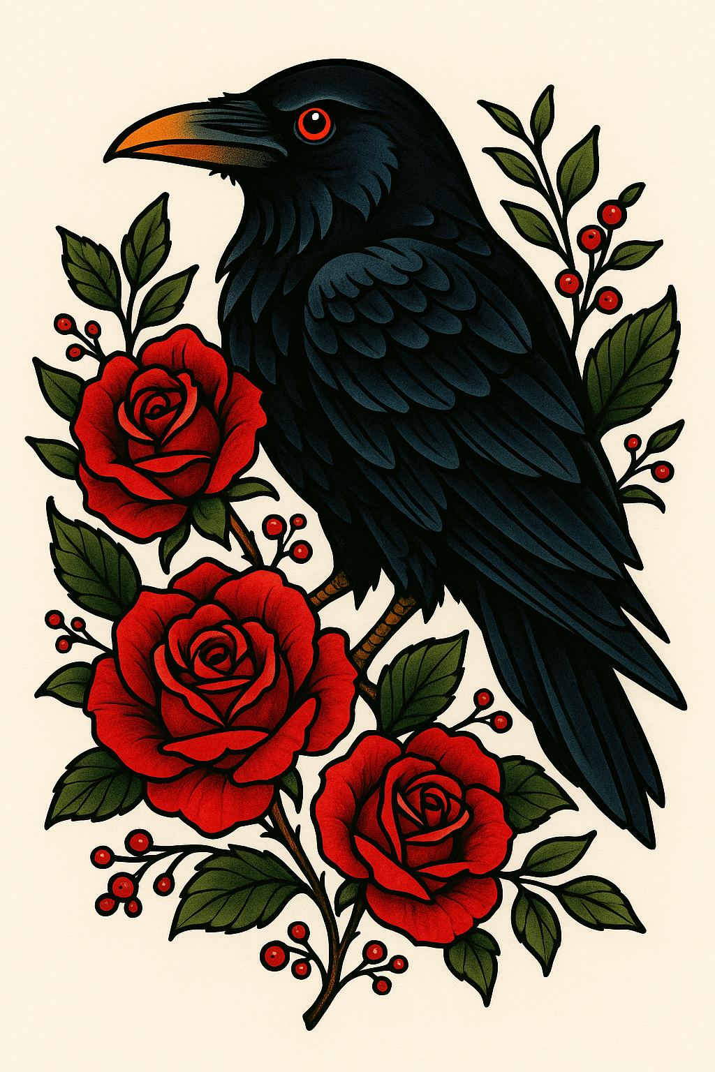 /Collection: /by davooda/Type: PNG/Vibrant and detailed illustration featuring a black raven perched among lush red roses, showcasing a bold artistic style suitable for tattoo art, prints, or home decor.