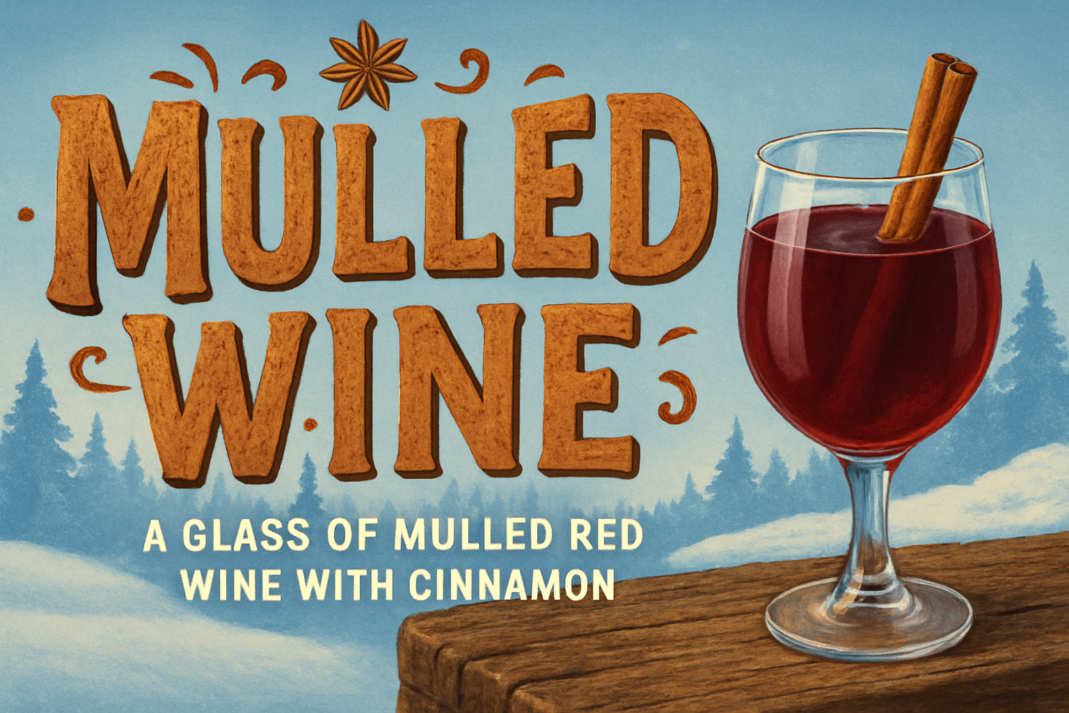 Charming illustration showcasing a glass of mulled red wine garnished with a cinnamon stick, perfect for winter-themed promotions or beverage menus.