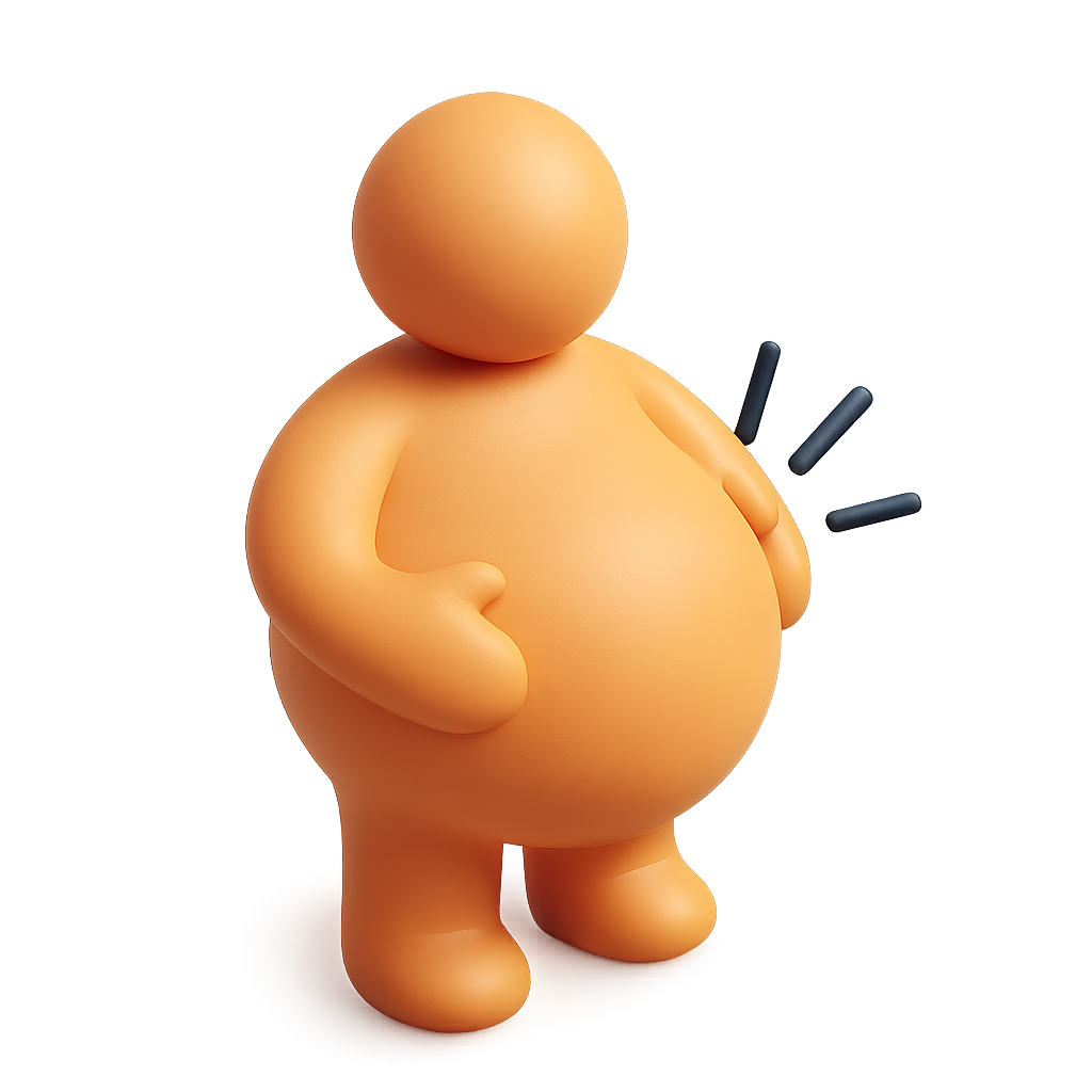 A stylized 3D icon depicting a rounded figure with a noticeable belly, designed in an isometric perspective. The figure has an orange hue and a glossy finish, set against a soft gradient background.