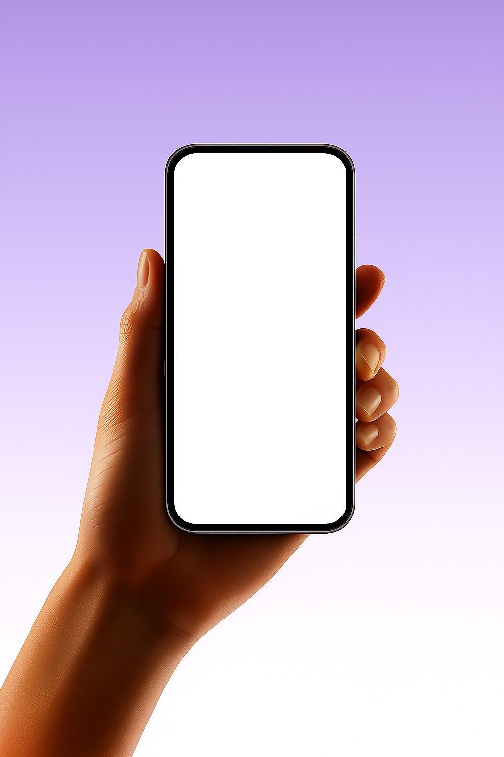 /Collection: /by davooda/Type: PNG/A hand holding a modern smartphone with a blank screen against a soft gradient background transitioning from purple to white. The image focuses on the device's sleek design.