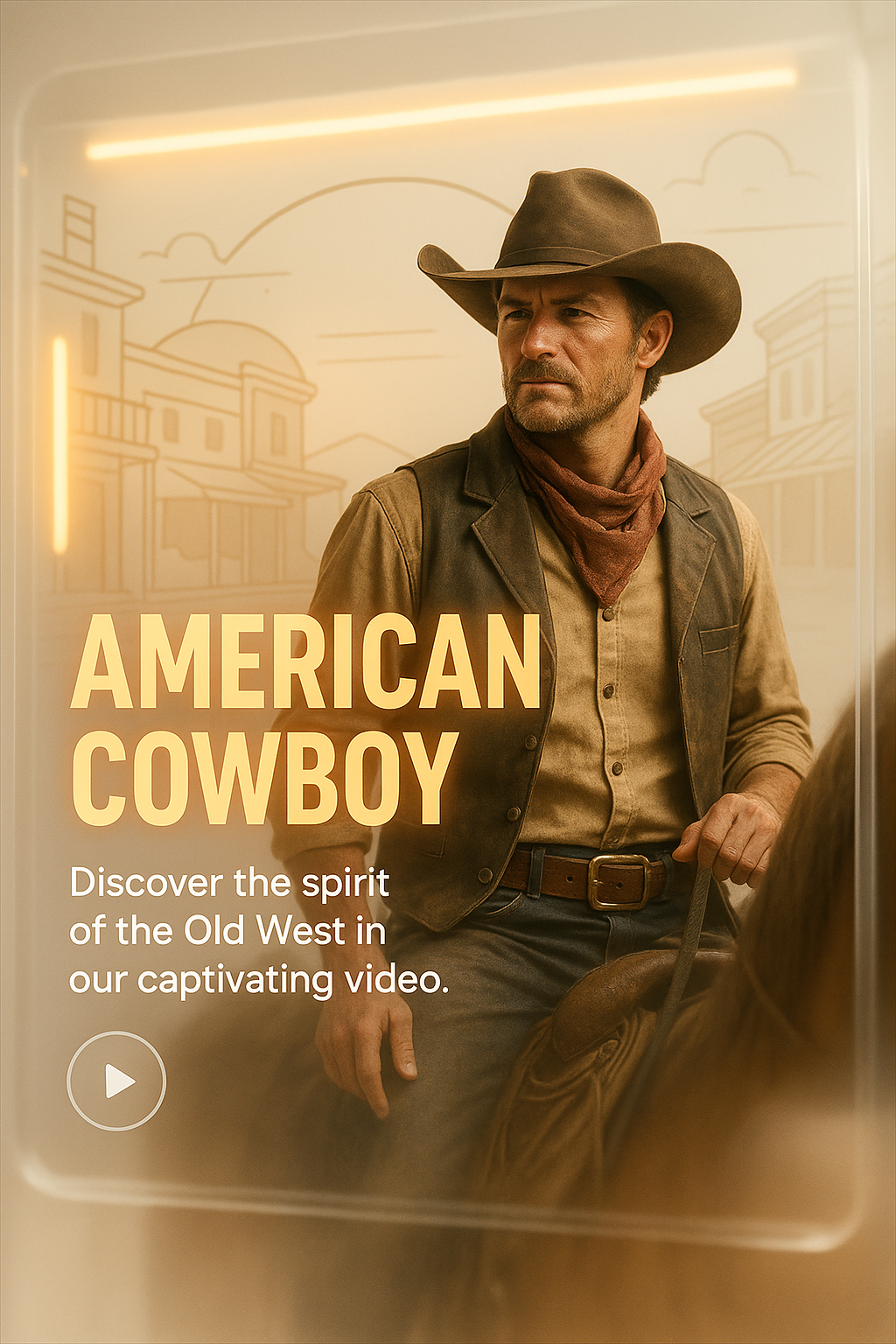 /Collection: /by davooda/Type: PNG/Engaging promotional graphic showcasing an American cowboy character, designed for video marketing. The visual style combines vintage Western elements with modern design.