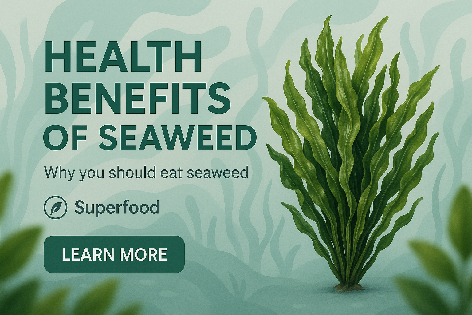 A visually appealing infographic highlighting the health benefits of seaweed, designed for educational or promotional purposes in health and wellness contexts.