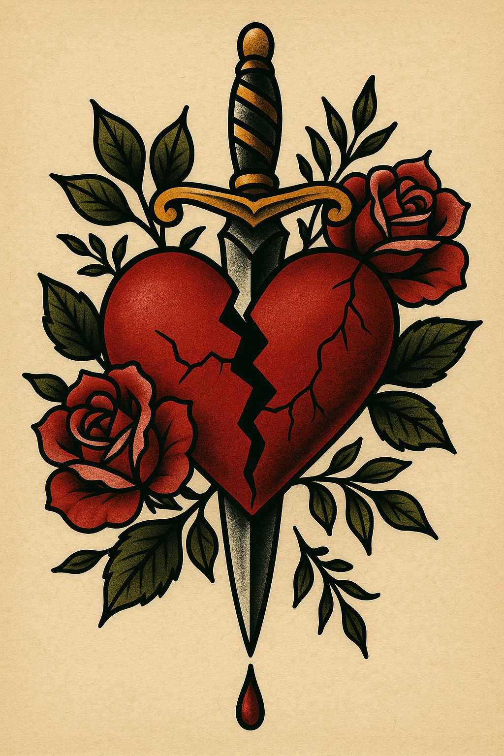 /Collection: /by davooda/Type: PNG/A vibrant tattoo-style illustration featuring a broken heart pierced by a dagger, surrounded by roses. This graphic is ideal for tattoo design or romantic-themed art.