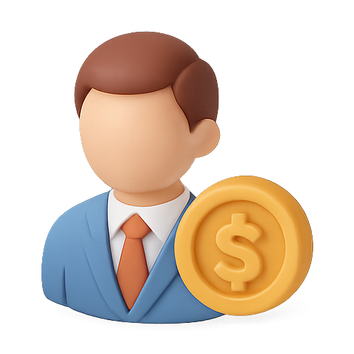 3D-rendered icon representing a businessman alongside a dollar coin, ideal for finance or business-related content. The design is modern and simplistic, suitable for digital applications.