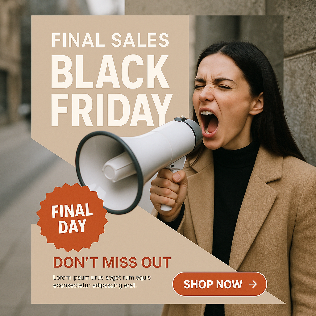 /Collection: /by davooda/Type: PNG/A stylish brunette woman passionately announces final sales on Black Friday using a loudspeaker. The image features a layered composition with clear text overlays and vibrant colors.