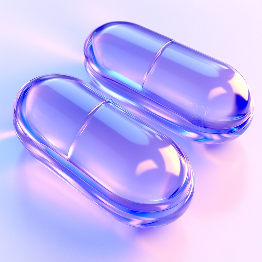 A visually appealing 3D rendering of two glossy capsules with a soft gradient background. Ideal for pharmaceutical, wellness, or health-related themes.