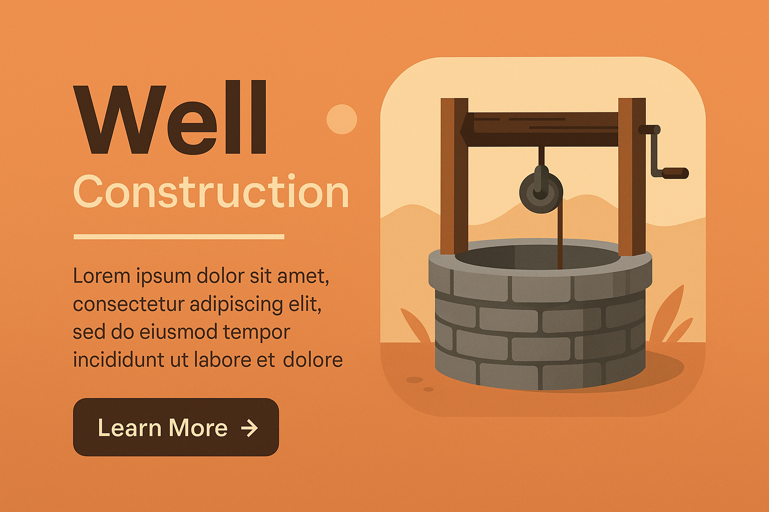 /Collection: /by davooda/Type: PNG/A modern illustration of a well featuring a layered composition with a gradient background. The design incorporates a stone well, a wooden beam, and an interactive 'Learn More' button, creating a professional yet engaging aesthetic.
