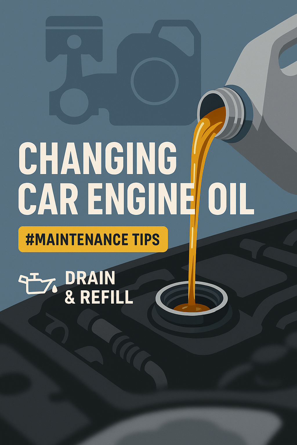 /Collection: /by davooda/Type: PNG/Informative infographic depicting the process of changing car engine oil, featuring a graphic of oil pouring into an engine. Ideal for automotive maintenance guidance.