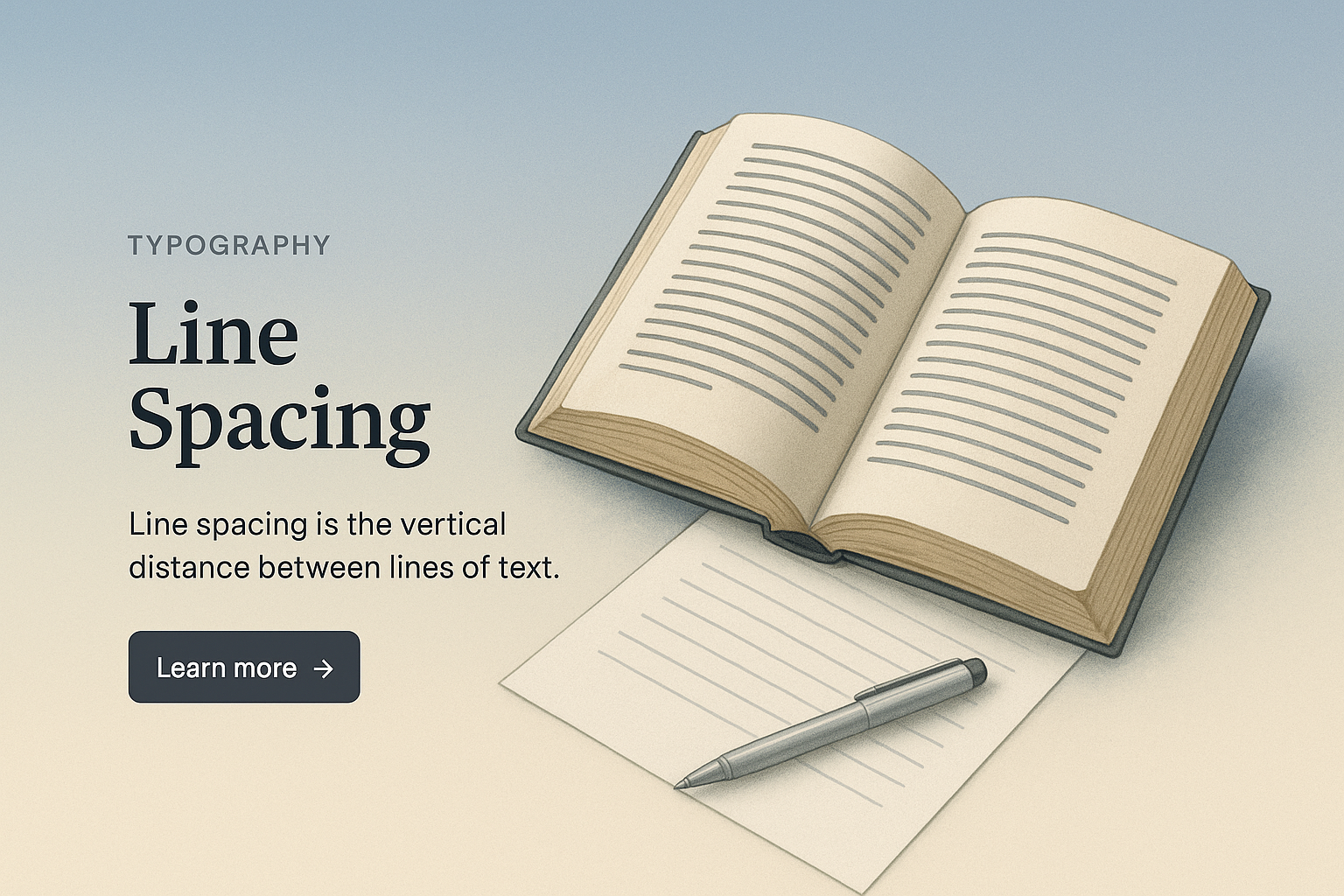 A stylish web page design focusing on line spacing, featuring an open book, pen, and clear typography. The gradient background enhances readability.